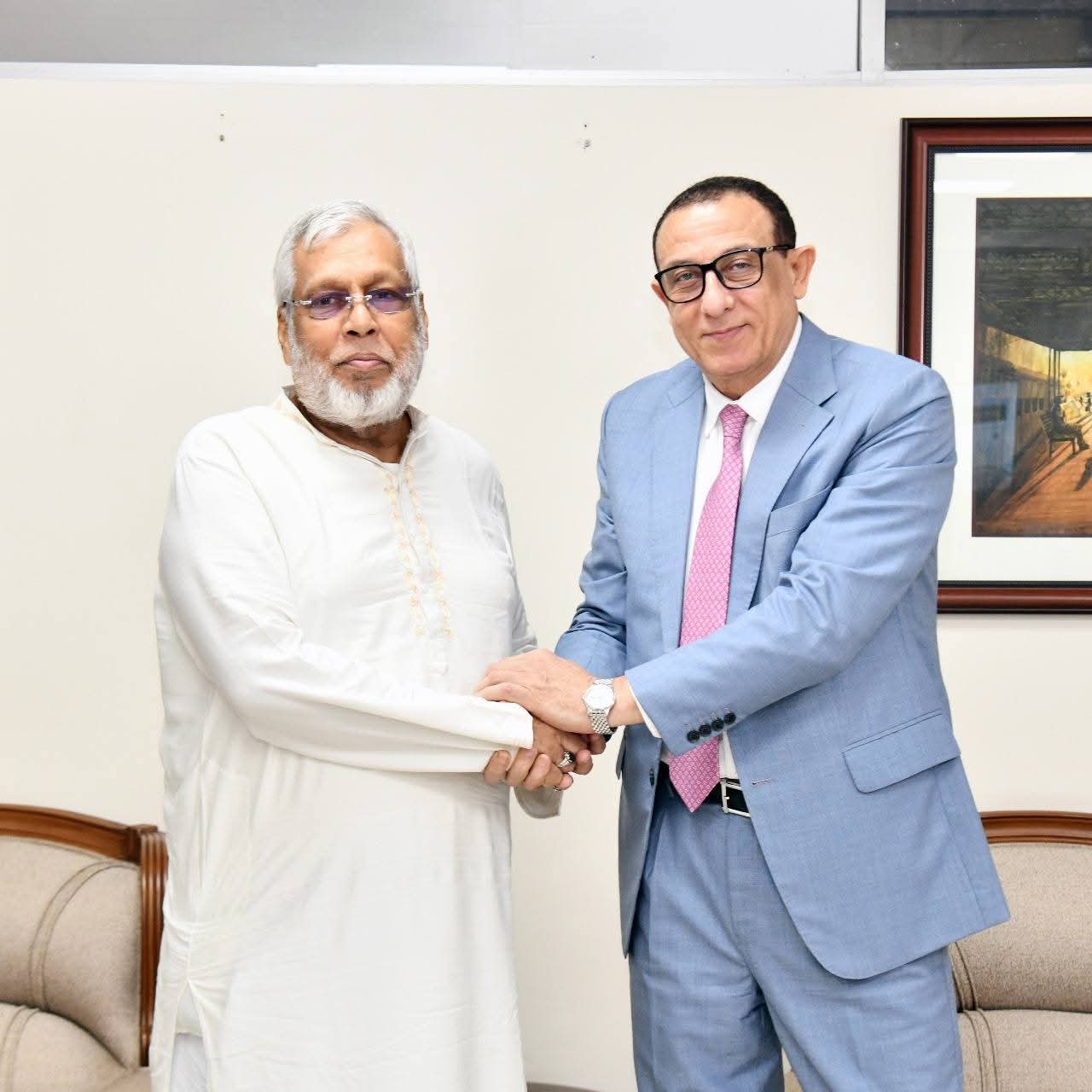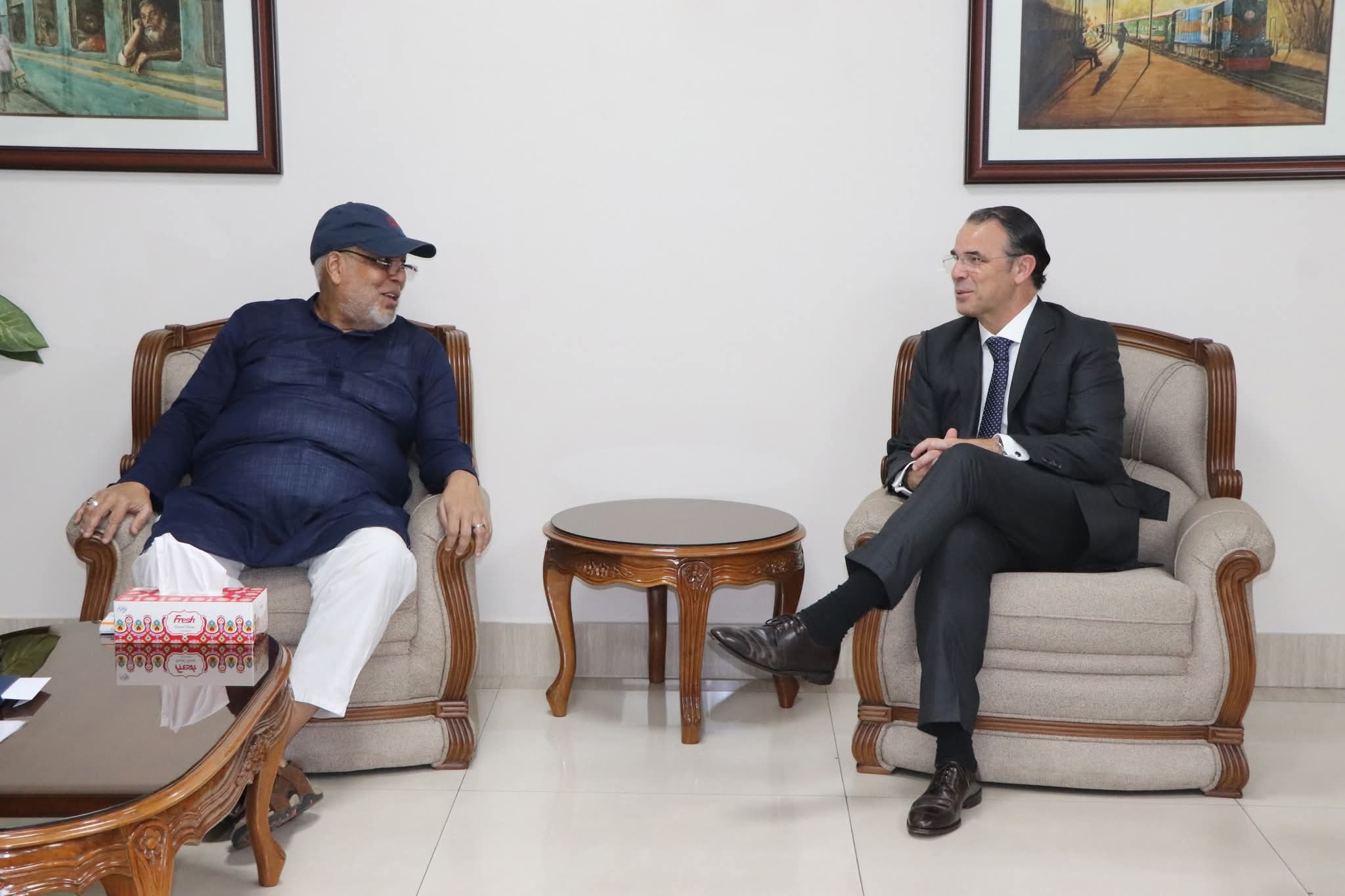 বিদ্যুৎ, জ্বালানি ও খনিজ সম্পদ, সড়ক পরিবহন ও সেতু এবং রেলপথ মন্ত্রণালয়ের দায়িত্বে নিয়োজিত মাননীয় উপদেষ্টা মুহাম্মদ ফাওজুল কবির খান-এর সাথে আজ সকালে রেলপথ মন্ত্রণালয়ের অফিসকক্ষে বাংলাদেশে নিযুক্ত ফিলিস্তিন রাষ্ট্রদূত ইউসুফ এসওয়াই রমজান সৌজন্য সাক্ষাৎ করেন।